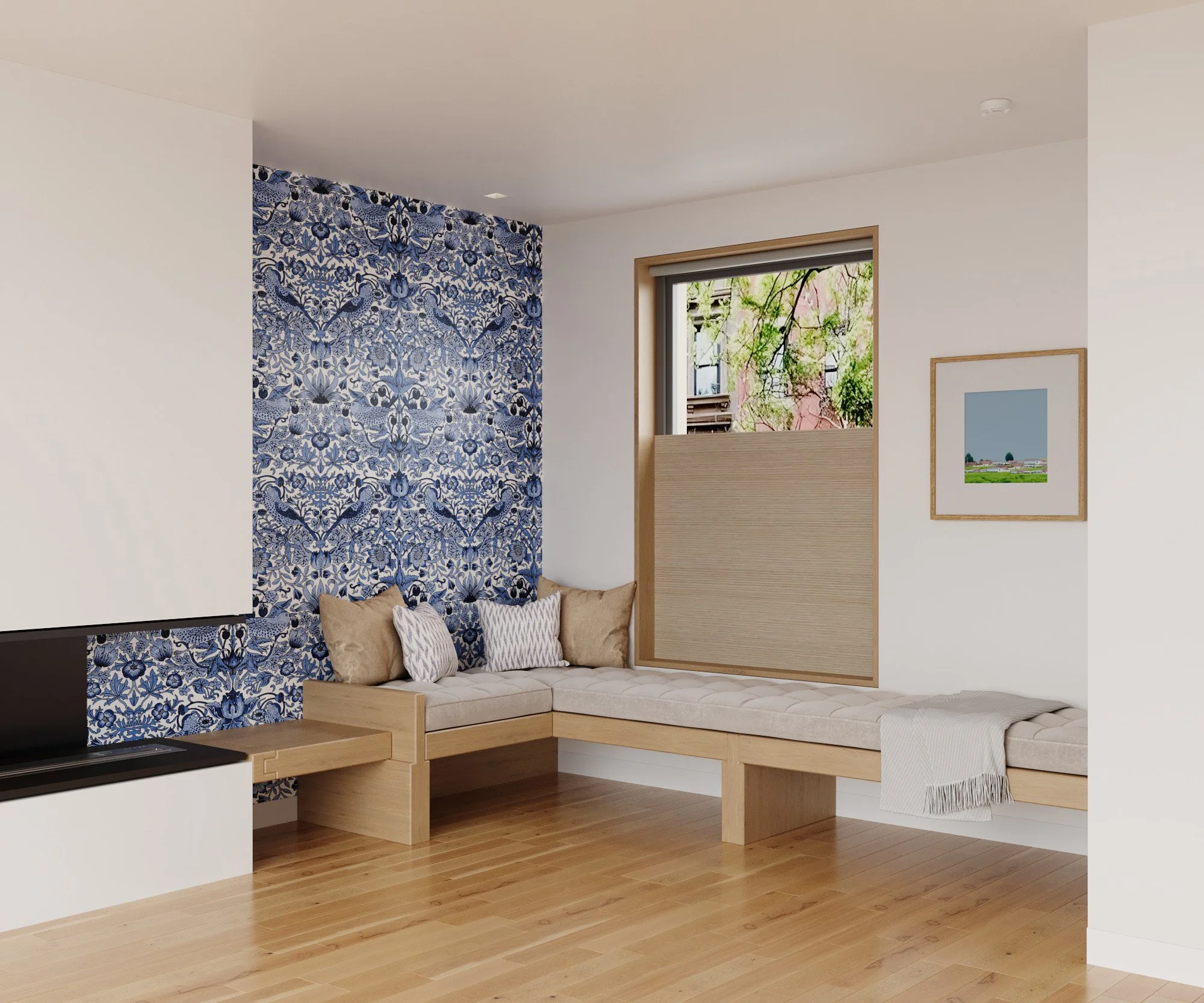 Design of an interior sitting room with sustainable white oak wood, organic seat covers and pillows and natural wallpaper, Carroll Gardens Brooklyn.